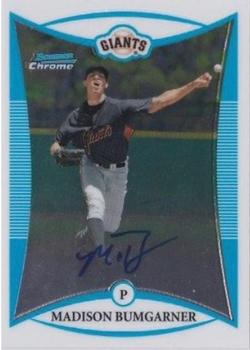 10) Madison Bumgarner, P Giants – Finally, another name that has historical value. His World Series exploits are the thing of legend. Had 120 victories and four All-Star appearances with San Francisco, along with a post-season ERA of 2.11. His 2008 Bowman Chrome RC Auto is valued at $60.