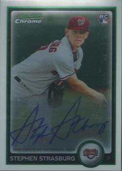 2) Stephen Strasburg, P Nationals – The first player taken in the 2009 Draft, he has had great success but has also battled injuries. His lifetime mark is 112-59. The RC Auto is from 2010 Bowman Chrome and sells for $25.
