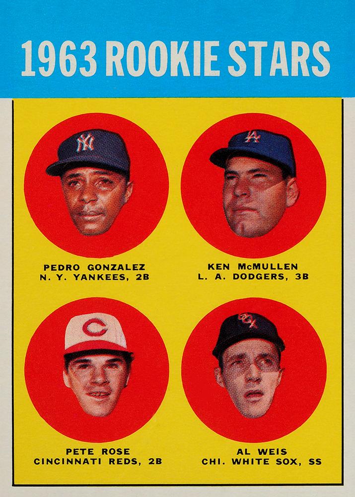 The 1963 Topps set included a concept where many of the rookies were shown together on cards that had small, cropped photos of four different players…and they were in the high series. That is where you’ll find the rookie card of Pete Rose…shown with Pedro Gonzalez, Ken McMullen & Al Weis. While not very visually appealing, it is still a valuable card indeed at a book price of $2,200. Willie Stargell’s rookie card ($265) is also in this category and includes three more obscure players.