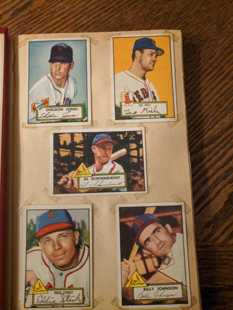 When Shirley arrived a few days later, she placed a small red scrapbook on the counter that looked like it was from the 1940’s. Upon opening the book, I discovered close to 100 cards from the iconic 1952 Topps set. Mixed emotions would be the only way to describe the experience, as the cards are certainly scarce but Shirley’s description of the condition was correct because the cards were taped onto the pages. The retail value of cards in this type of condition isn’t much but the memories are priceless. Especially when they came from Topps first set in the same week where we hear about the end of the Topps era.